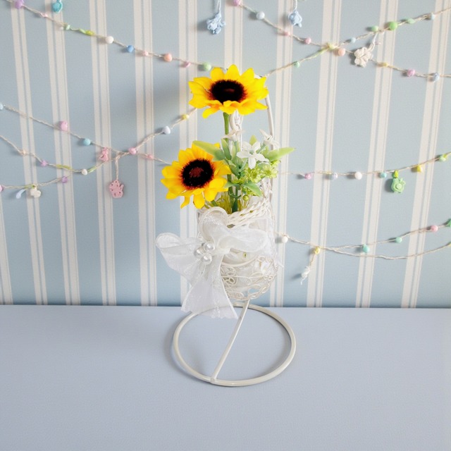 ### シューズのワイヤー小物入フラワーアレンジメント かわいらしさと実用性を兼ね備えた、シューズのワイヤー小物入フラワーアレンジメントをご用意しました! こちらのアレンジメントは、シューズの形をしたワイヤー容器に、元気なヒマワリを使用した華やかなデザインが特徴です。色鮮やかなお花たちが、あなたのインテリアに明るさをもたらし、日々の生活に活力を与えてくれることでしょう!飾った瞬間、心が躍る特別な空間を演出します。 すべて手作りで、温もりを感じる仕上がりになっています。 丁寧に梱包し、簡易ラッピングでお届けいたします。 ■ 色合いとサイズ - アレンジメントのサイズ: ワイヤーシューズ:W12cmD5.5H4cm 全長約19cm - 使用している素材: ワイヤー ヒマワリ、その他の小花 アーティフィシャルフラワー ■ 素材と製造国 - 使用素材は全て高品質で厳選したものを使用 - 環境に配慮した製造工程で作られています ■ お手入れと取り扱い注意事項 - 直射日光を避けてお楽しみください。 - 高温多湿の環境には置かないようご注意ください。 - お子様やペットの手の届かない場所に飾っていただくことをお勧めします。 ■ 発送と注文について - 注文後、3営業日以内に発送いたします。 - 丁寧に梱包し、安全にお届けできるよう心がけています。 ■ その他の情報 - シューズのワイヤー小物入フラワーアレンジメントは、インテリアとしての魅力だけでなく、特別なシーンの飾りつけにも最適です! - アレンジメントを通じて、あなたの空間に笑顔と癒しの時間をもたらします。 この機会に、シューズのワイヤー小物入フラワーアレンジメントであなたのお部屋を華やかに彩ってみませんか?