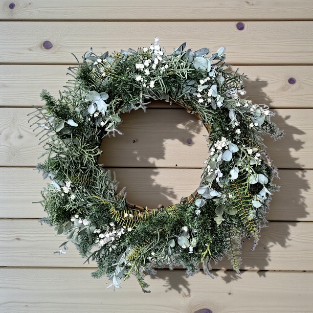 ### かすみ草と針葉樹の生花フレッシュグリーンリース 自然の恵みを感じる、かすみ草と針葉樹の生花フレッシュグリーンリースをご用意しました! このリースは、約30cmのサイズで、2025年12月23日に製作した生花リースです。現在は自然にドライフラワーへと変化し、お色味はそのまま保たれています。その後、レースのような優雅な雰囲気が漂い、飾るだけで心が癒される特別な空間を演出します。 すべて手作りで、丁寧な仕上がりとなっています。 丁寧に梱包し、簡易ラッピングでお届けいたします。 ■ 色合いとサイズ - リースのサイズ: 約30cm - 使用している素材: かすみ草、針葉樹、ヒムロスギ、シースターファン、ユーカリ、ブルーアイス。 ■ 素材と製造国 - 使用素材は全て高品質で厳選したものを使用 - 環境に配慮した製造工程で作られています ■ お手入れと取り扱い注意事項 - 直射日光を避けてお楽しみください。 - 高温多湿の環境には置かないようご注意ください。 - お子様やペットの手の届かない場所に飾っていただくことをお勧めします。 ■ 発送と注文について - 注文後、3営業日以内に発送いたします。 - 丁寧に梱包し、安全にお届けできるよう心がけています。 ■ その他の情報 - かすみ草と針葉樹の生花フレッシュグリーンリースは、インテリアとしての魅力だけでなく、特別なシーンの装飾にもぴったりです! - あなたの空間に自然の美しさを感じながら、心豊かな時間をお楽しみください。 この機会に、かすみ草と針葉樹の生花フレッシュグリーンリースであなたのお部屋をナチュラルに彩ってみませんか?