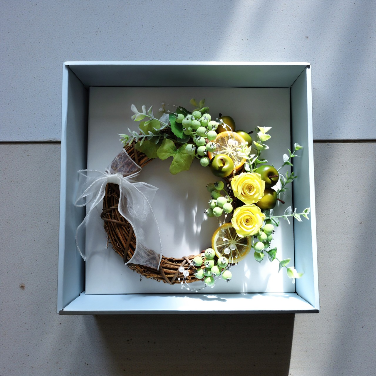 レモンとリンゴのリースは、鮮やかなレモンとジューシーなリンゴ、さらにブリザードフラワーの黄色のお花を組み合わせたアレンジメントです。心に残るビジュアルは、まるで爽やかな海の風が部屋に漂ってくるような感覚を与えてくれます。このリースは、明るいインテリアアクセントとして機能し、見る人の目を惹きつけることでしょう。特別な日の装飾や贈り物にも最適です!