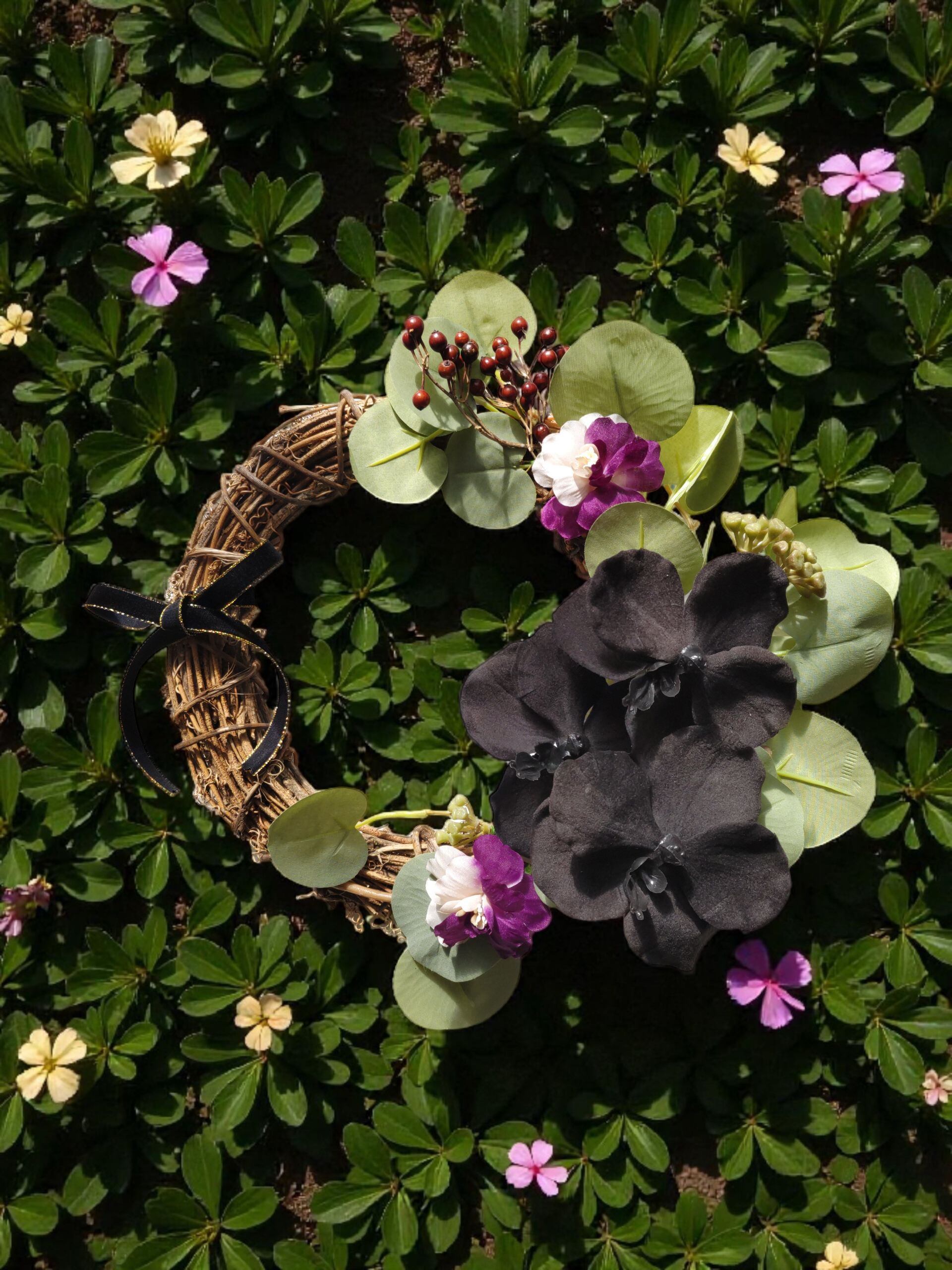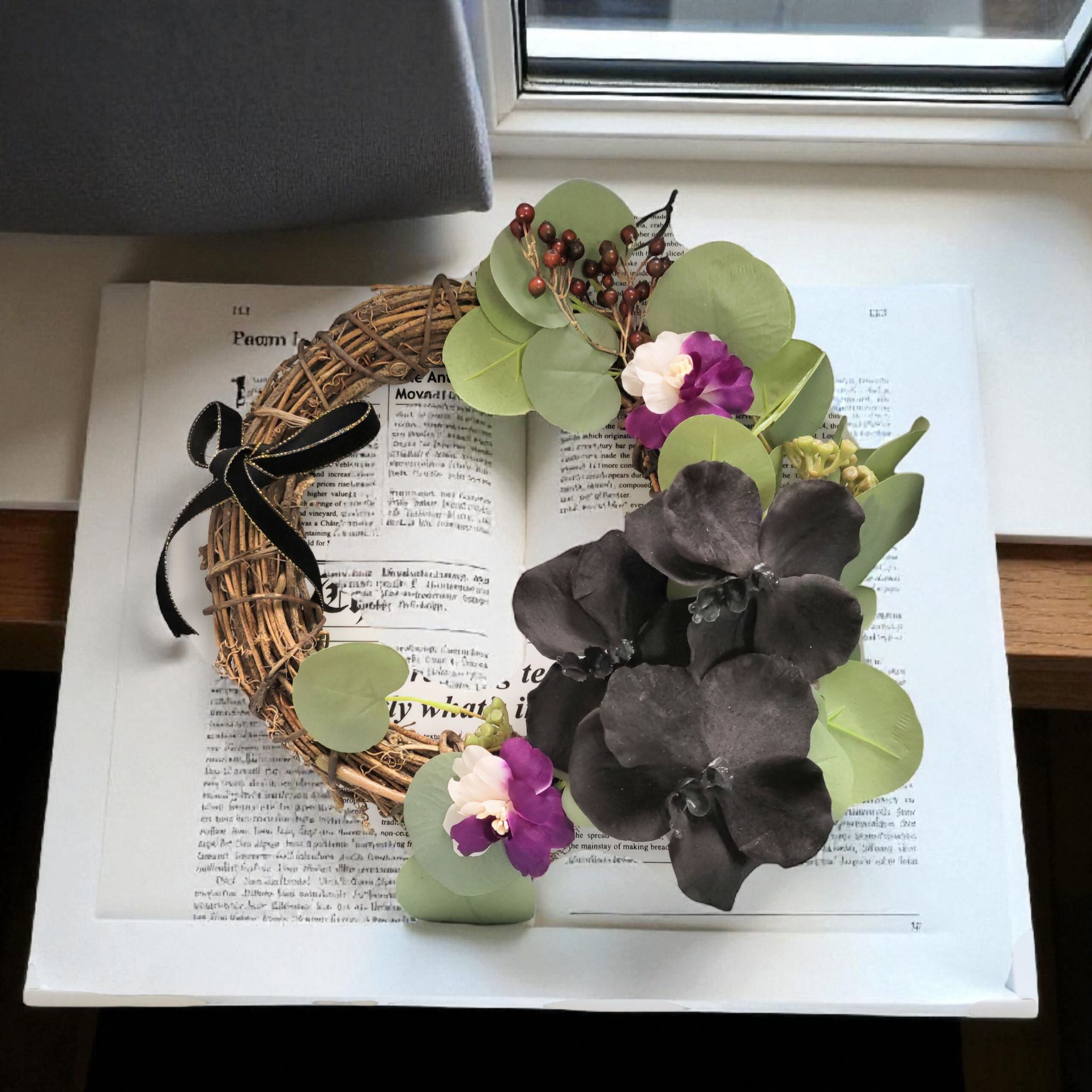 魅惑の黒い胡蝶蘭のリース、シックな雰囲気をお楽しみください