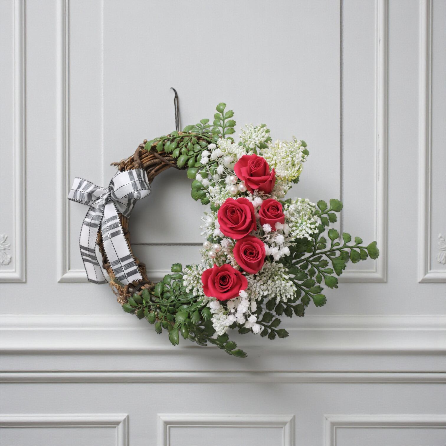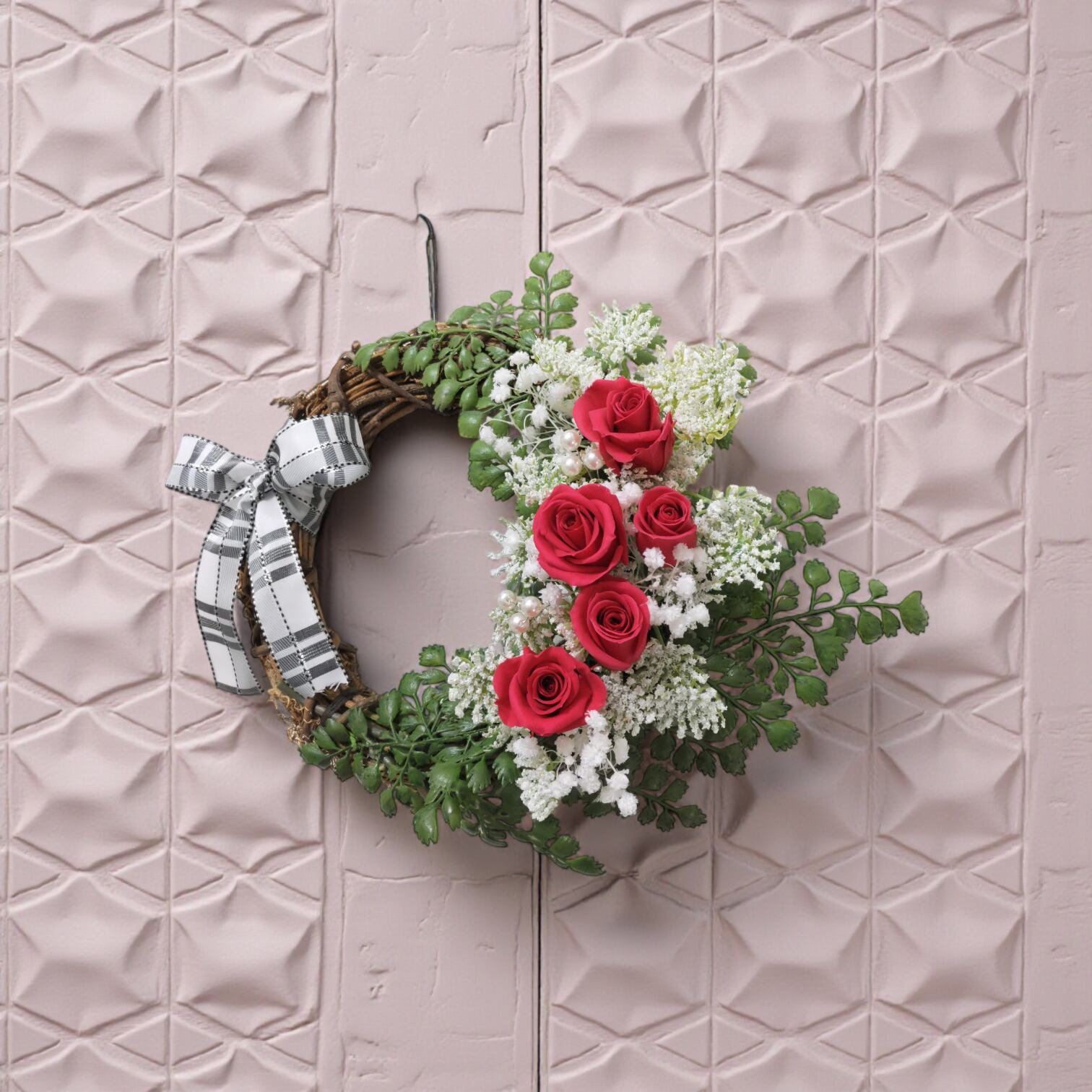 このリースは、約30cmのサイズで、ブリザーブドフラワーの赤い薔薇とかわいらしいかすみ草を使い、アーティフィシャルフラワーのグリーンと白のお花を巧妙に組み合わせています。目を引くデザインが空間を華やかに彩り、心に残る特別なひとときを作り出します!飾った瞬間、日常の中に優雅さと温かさをもたらしてくれることでしょう。