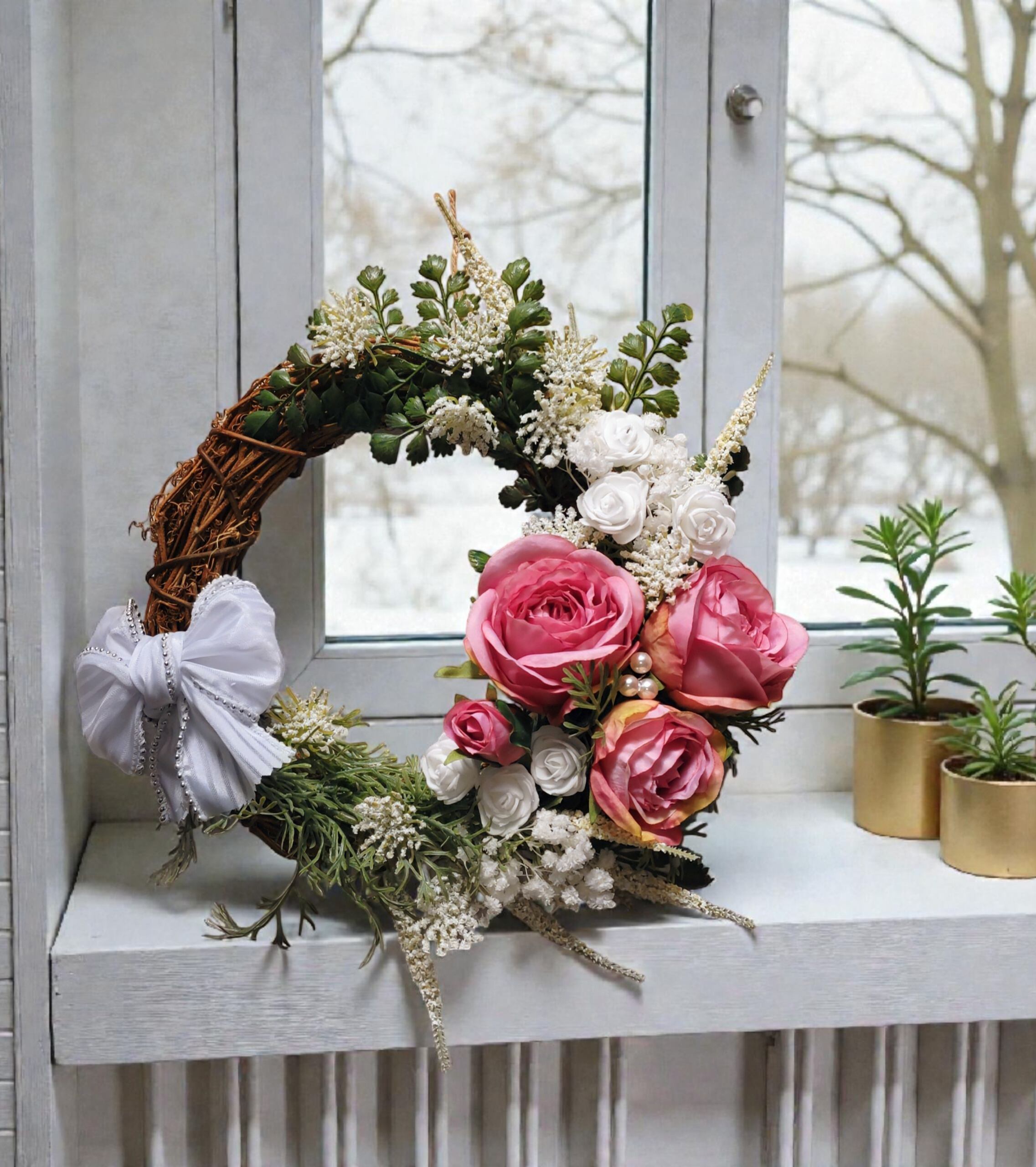 雪景色リースは、アーティフィシャルフラワーの薔薇とブリザーブドフラワーのカスミ草を贅沢に使用し、冬の美しい情景を表現したアレンジメントです。雪の結晶が輝き、豪華なリボンはまるで銀世界を思わせるデザインが魅力です。このリースは、冬のインテリアアクセントとして最適で、見る人の心を惹きつけることでしょう。特別な季節の装飾や贈り物にもぴったりです!