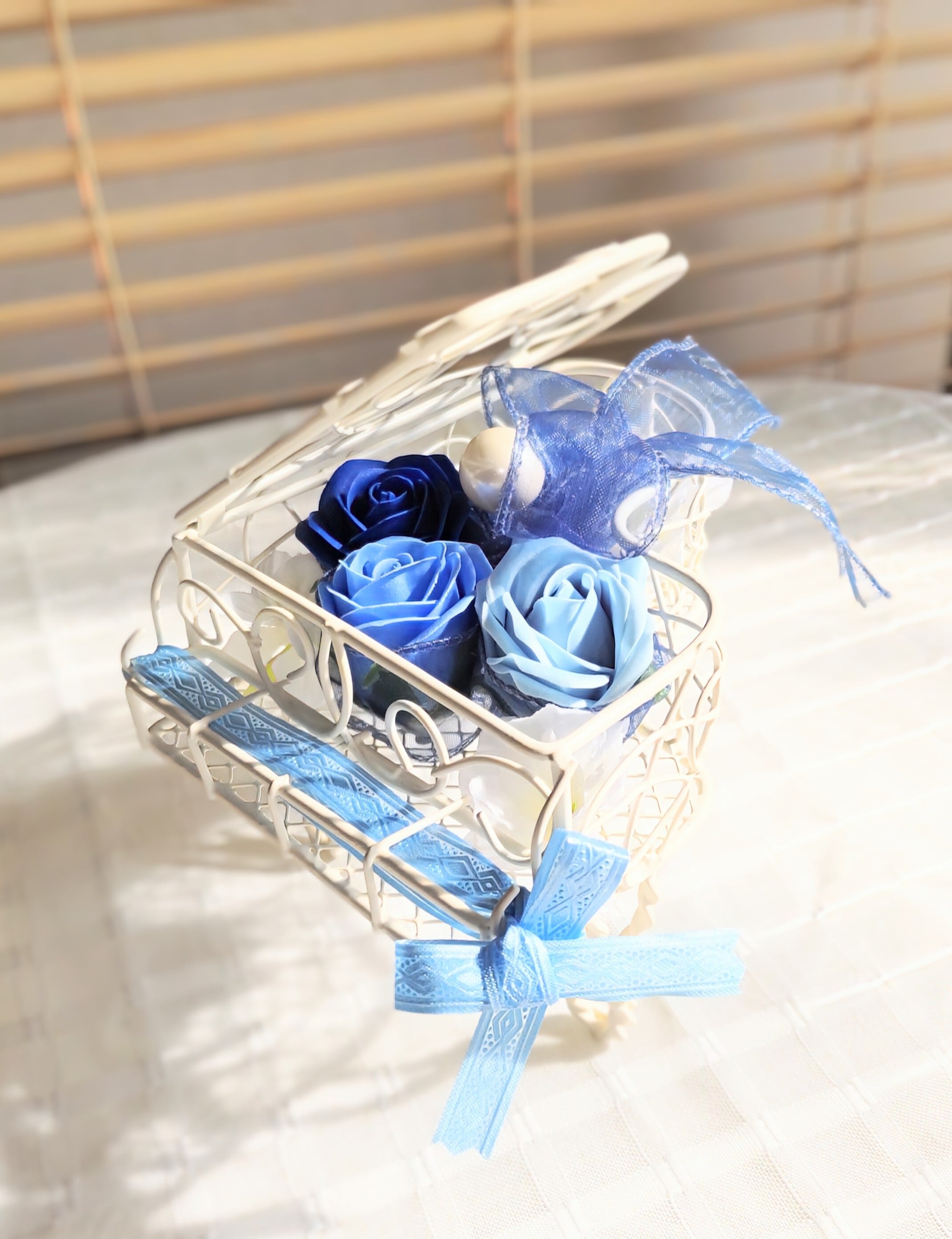 このアレンジメントは、約35cmのサイズで美しいブルーのソープフラワーを使用し、ピアノの形状に仕上げられています。お部屋のインテリアにも絶妙にマッチし、見る人の心を惹きつけること間違いなしです。このアイテムは、飾るだけでなく、長期間楽しむことができる素敵なギフトです!