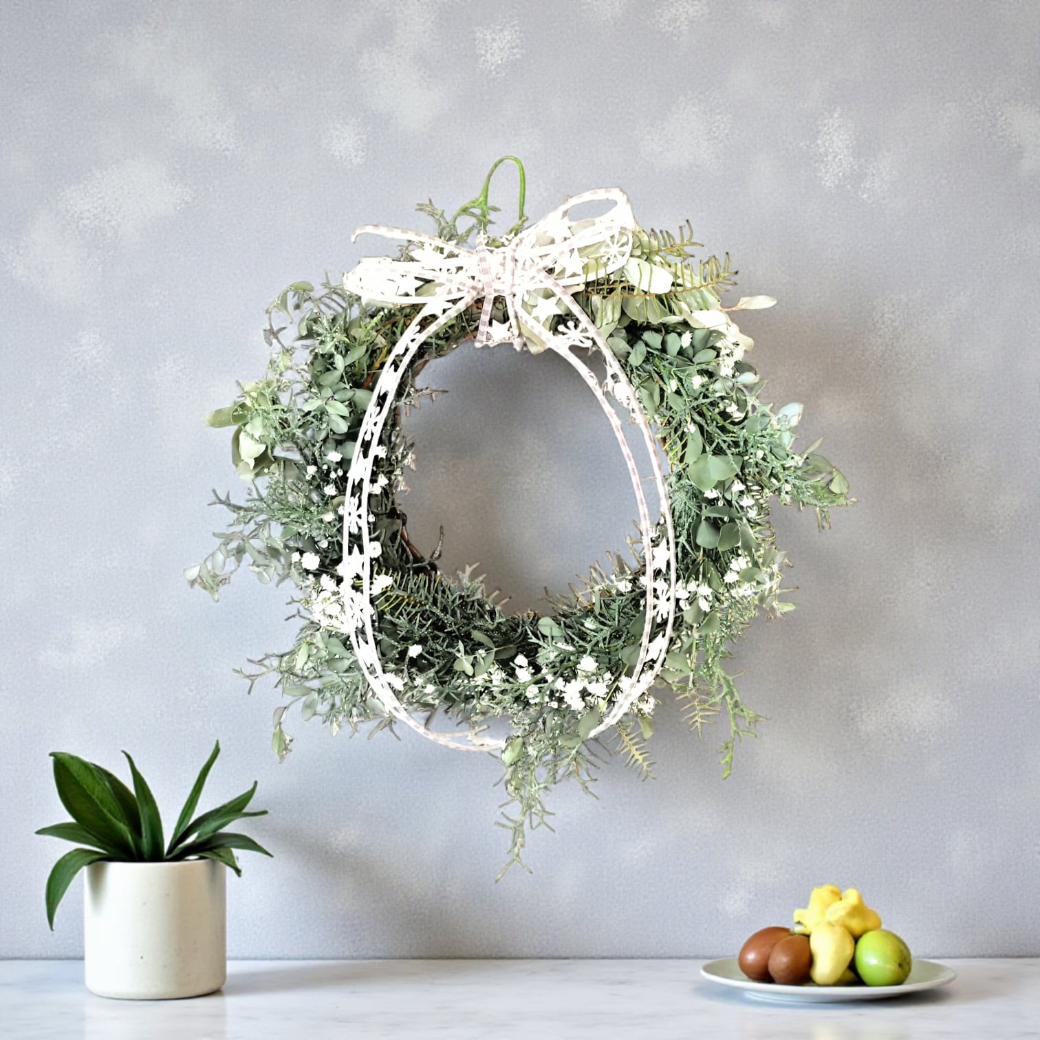 - オリーブとかすみ草のリースは、インテリアとしての魅力だけでなく、特別なシーンの装飾にもぴったりです!