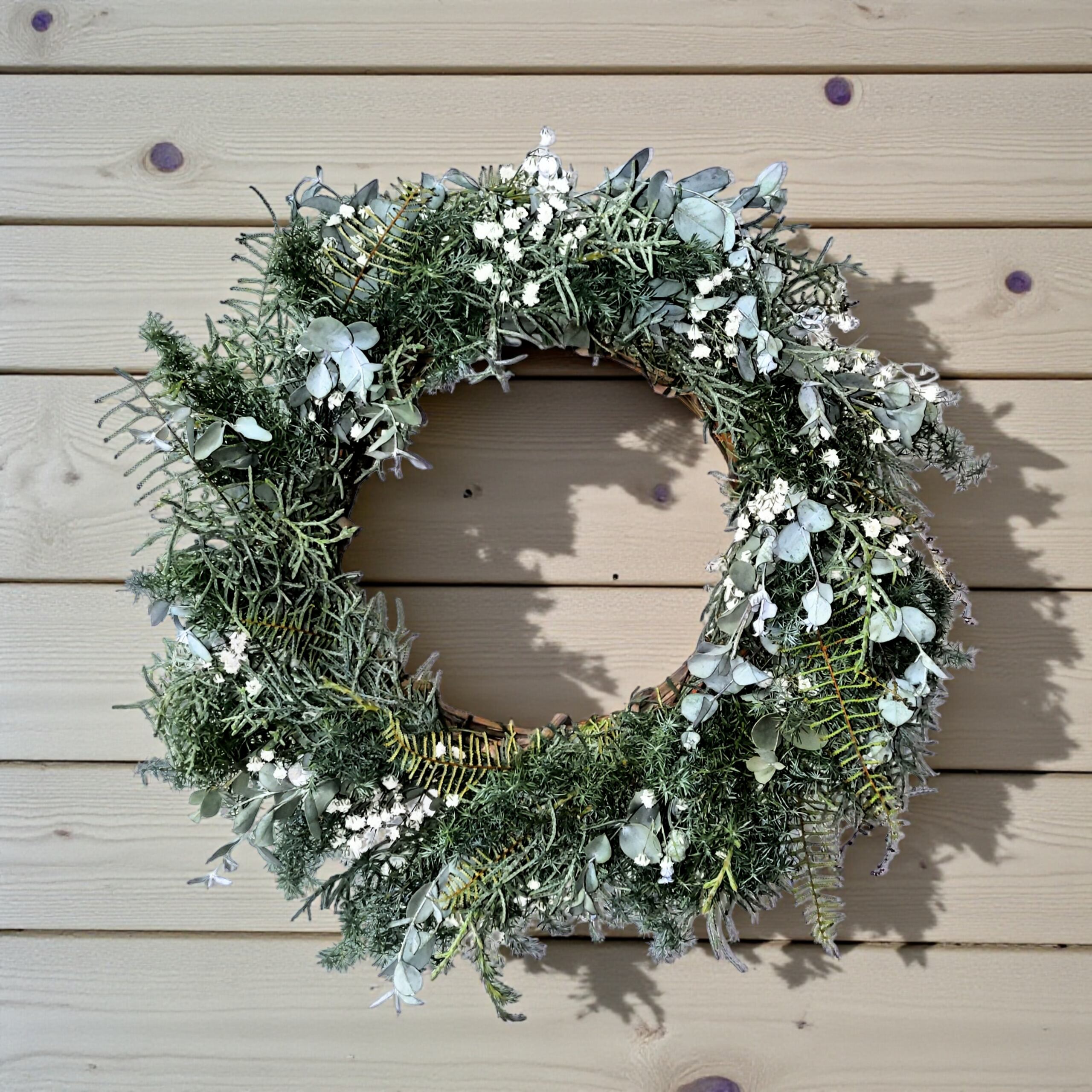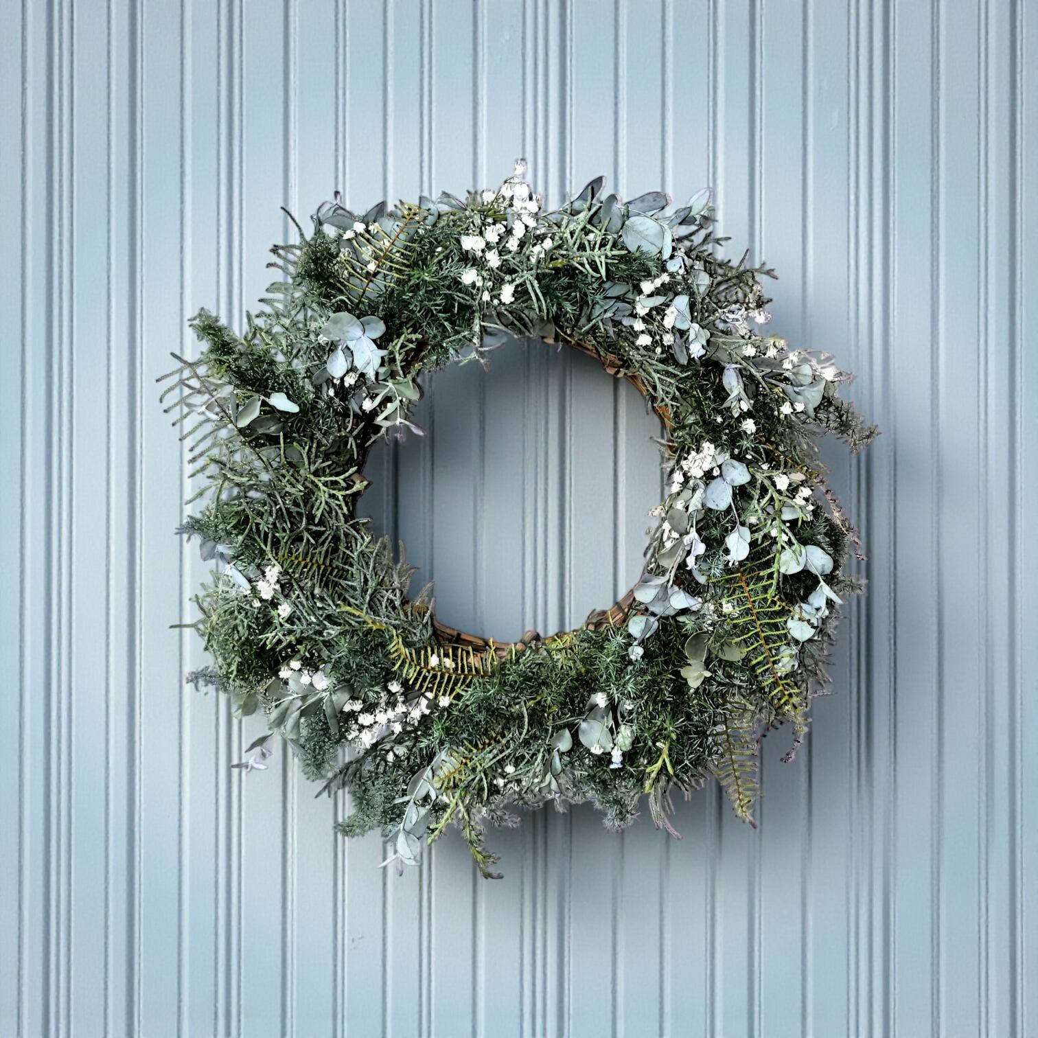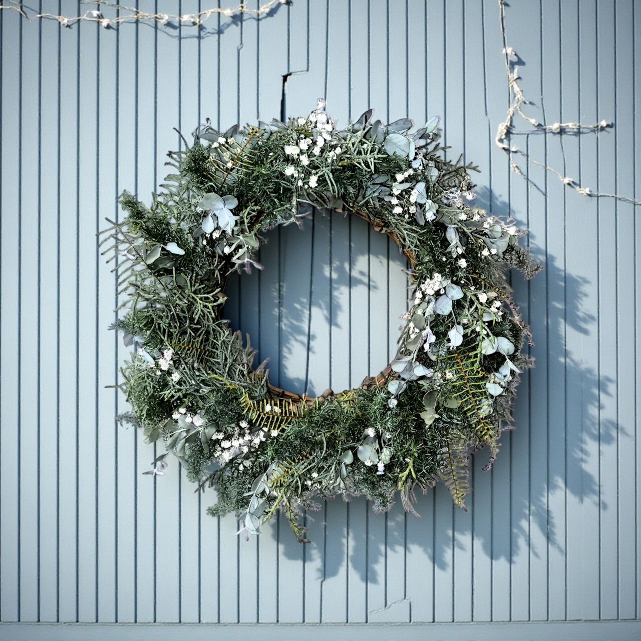 自然の恵みを感じる、かすみ草と針葉樹の生花フレッシュグリーンリースをご用意しました!