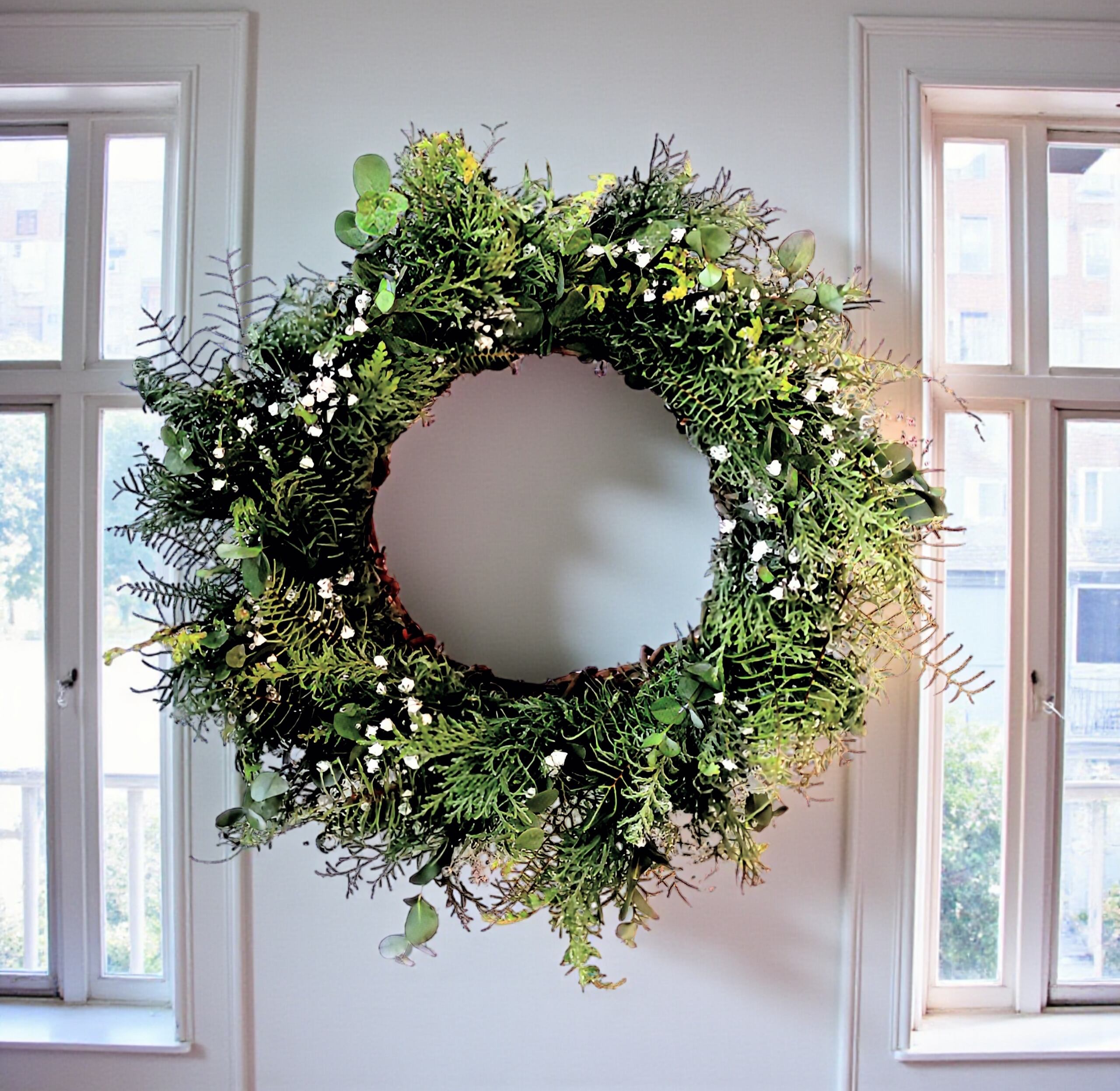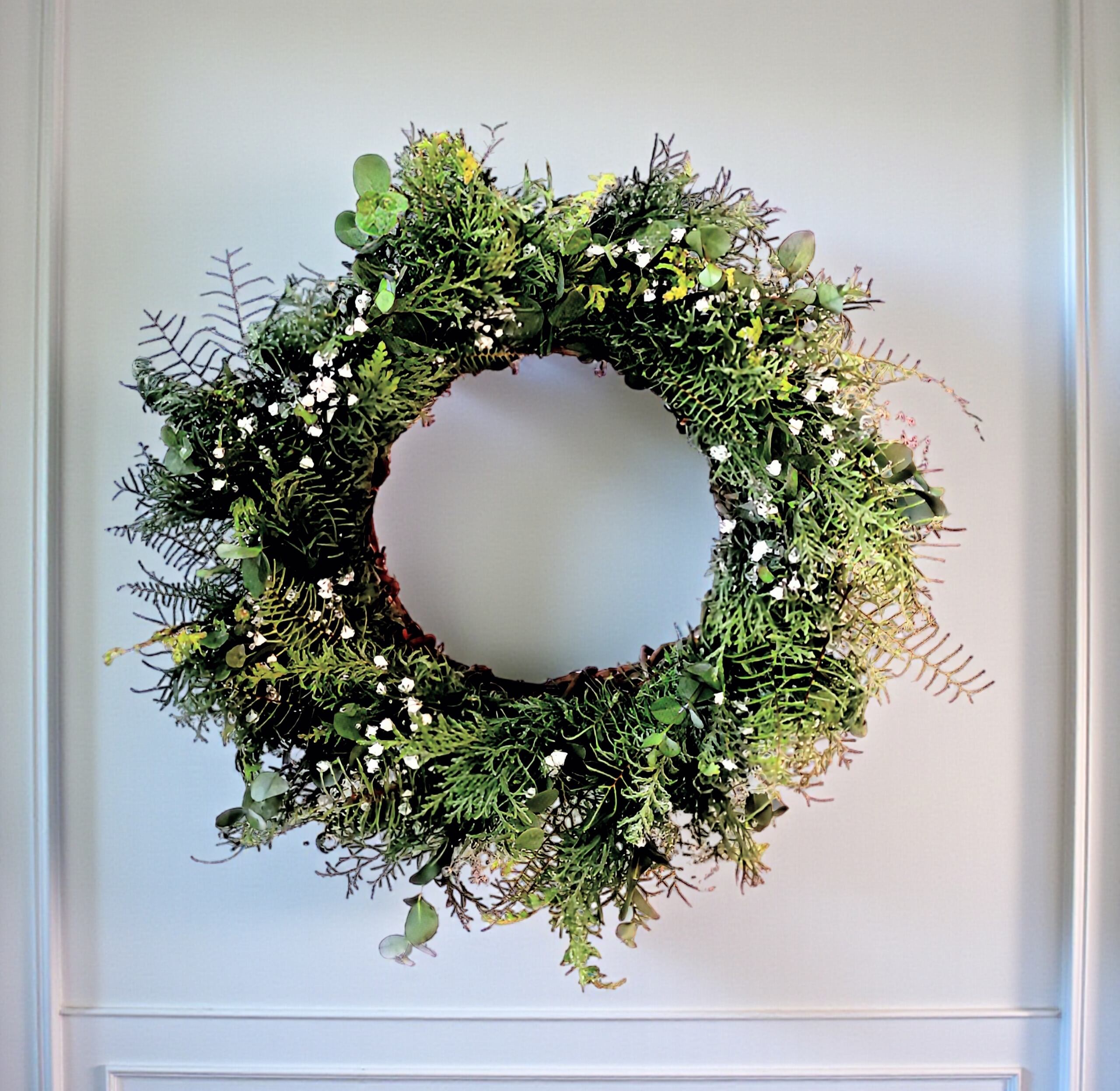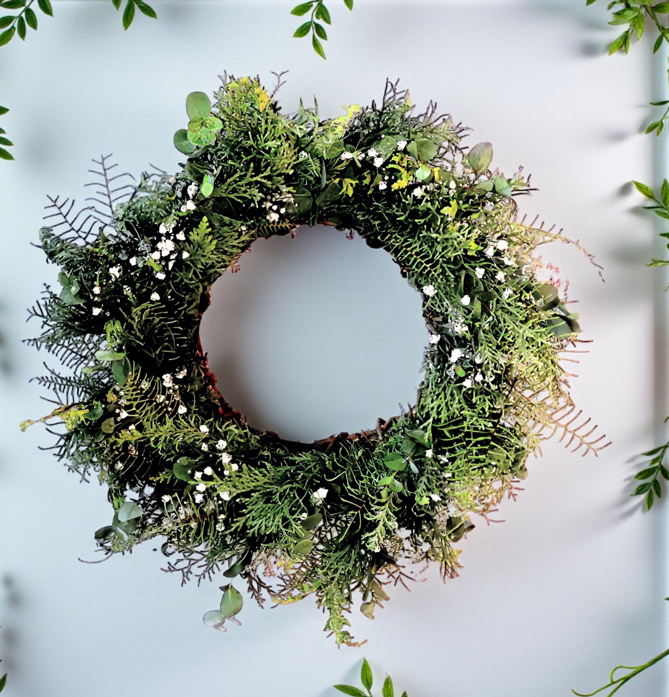自然の美しさを感じる、かすみ草と針葉樹のフレッシュグリーンリースをご用意しました!