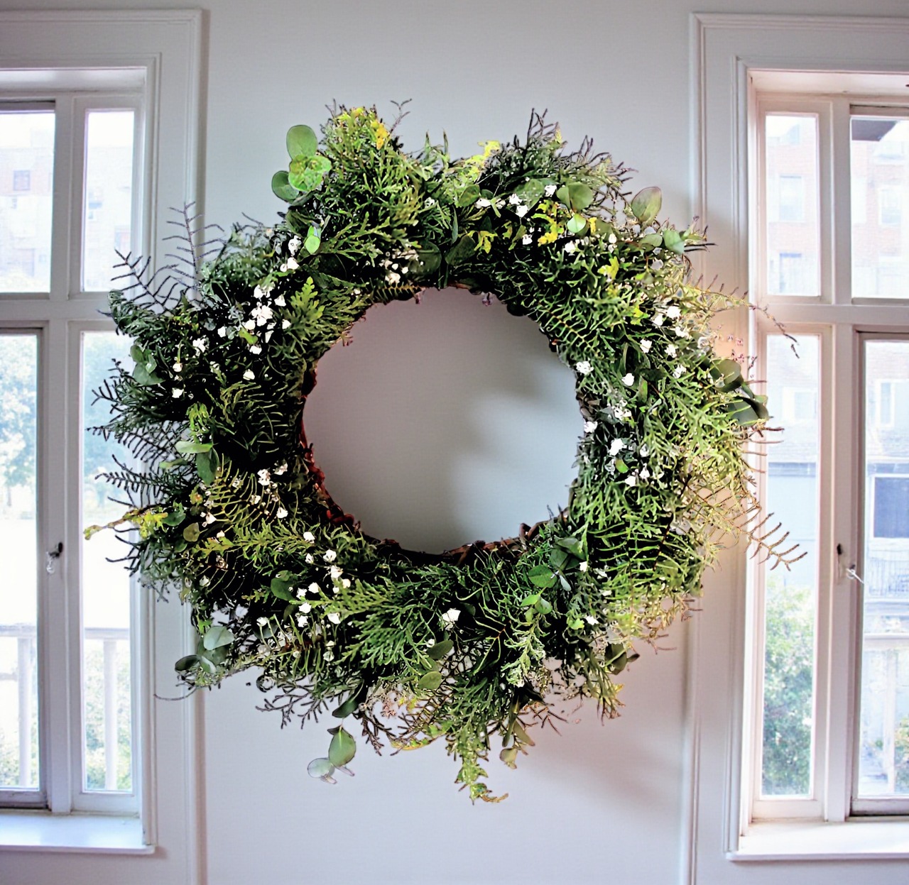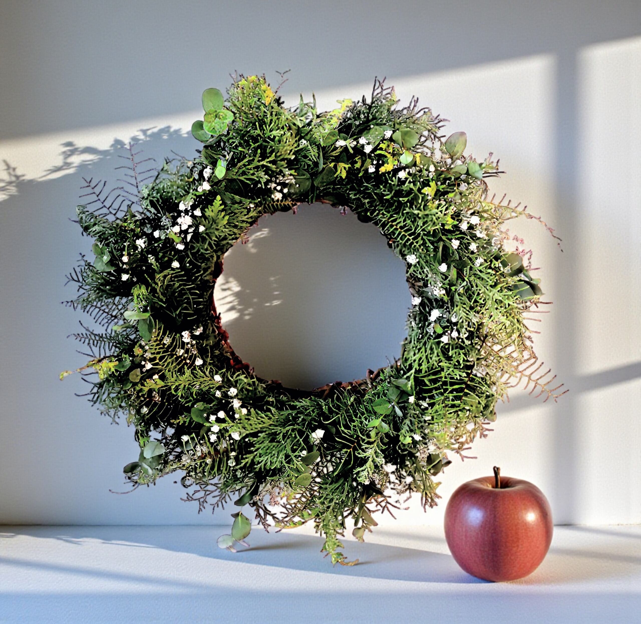 - かすみ草と針葉樹のフレッシュグリーンリースは、インテリアとしての魅力だけでなく、特別なシーンの装飾にもぴったりです!