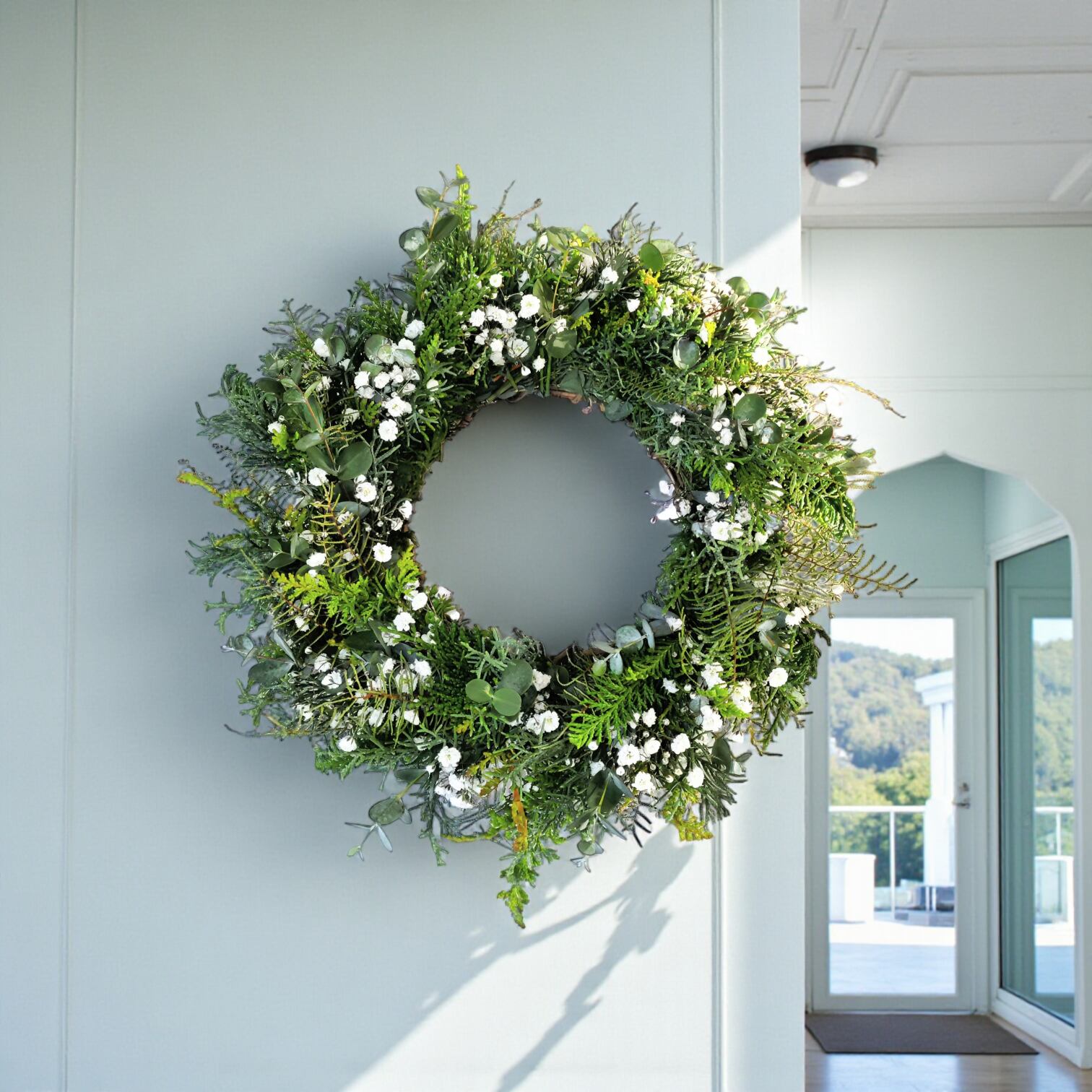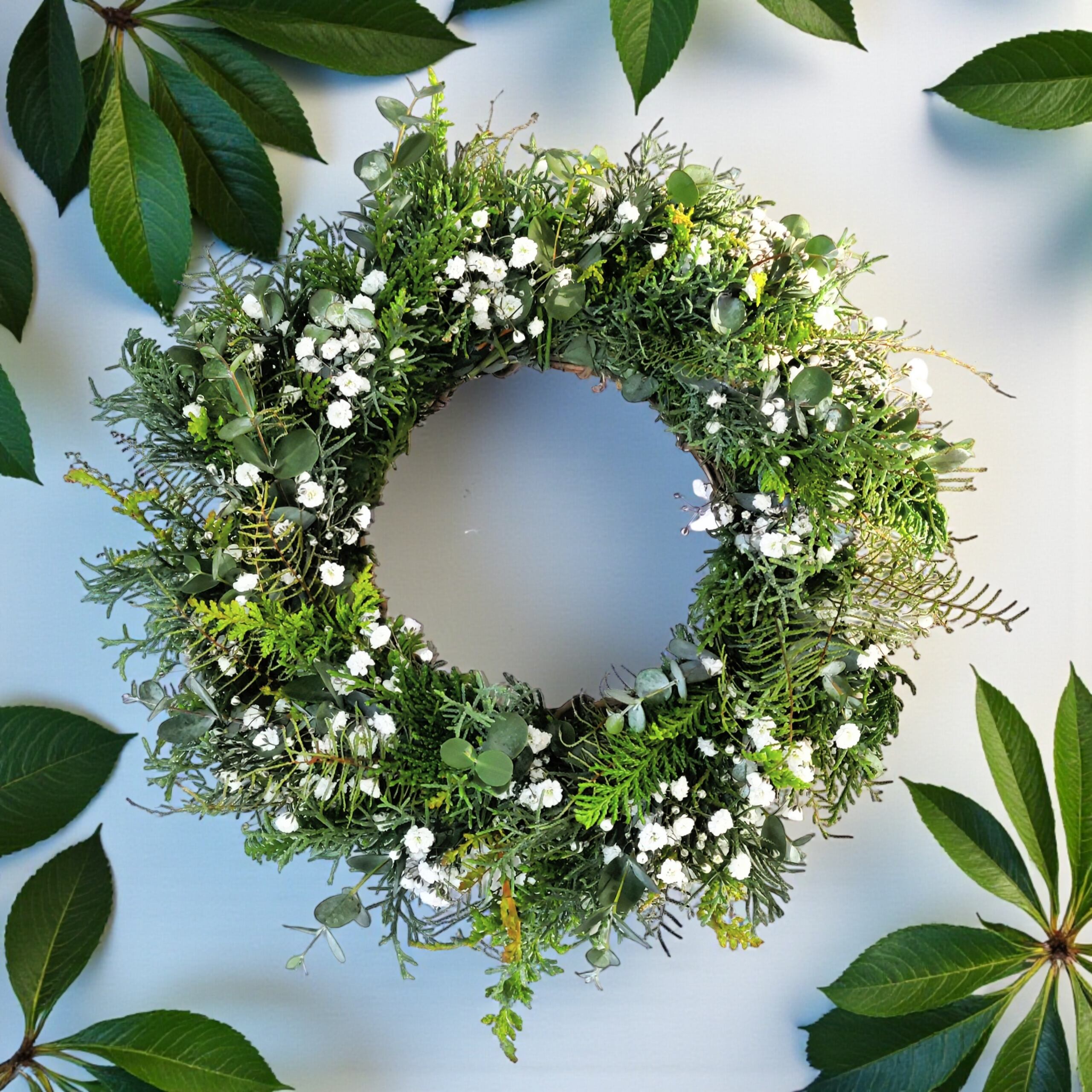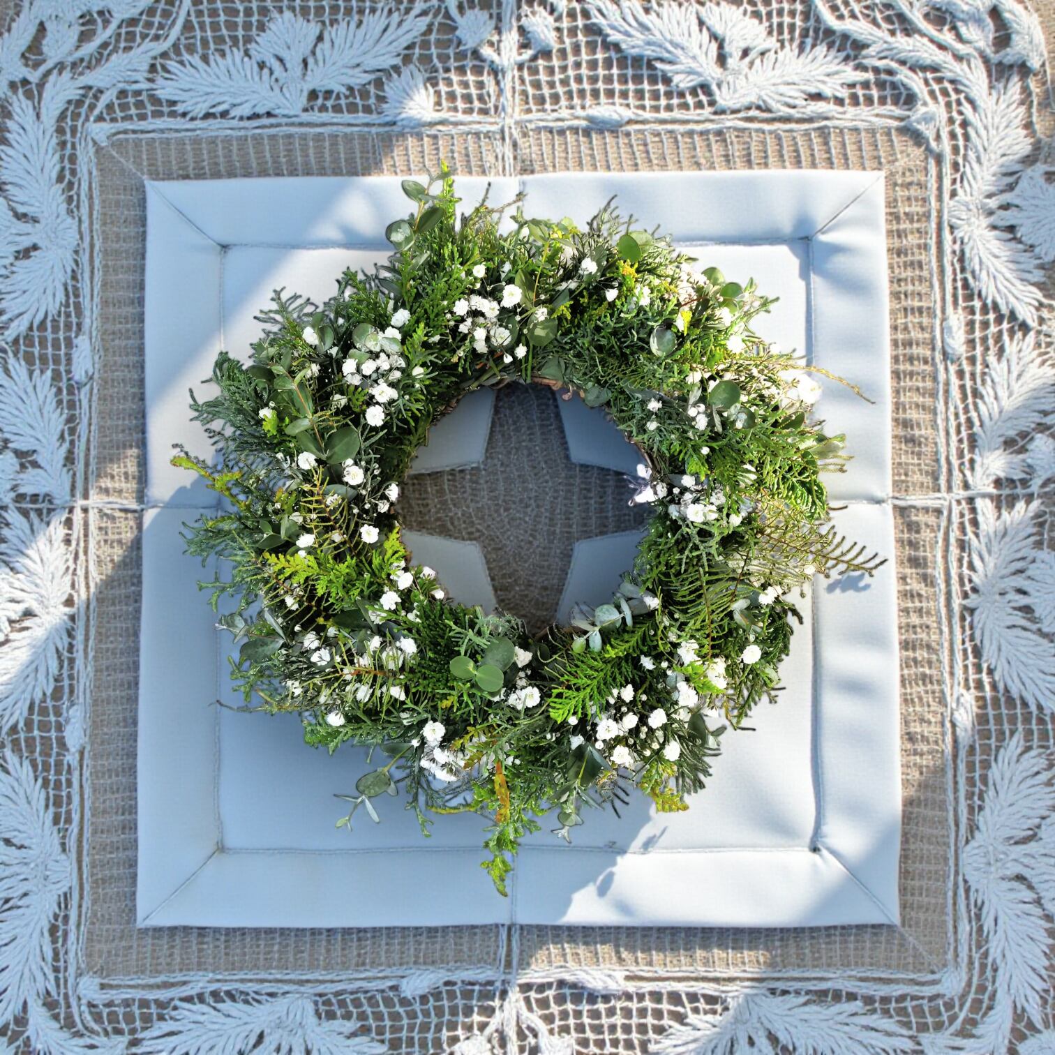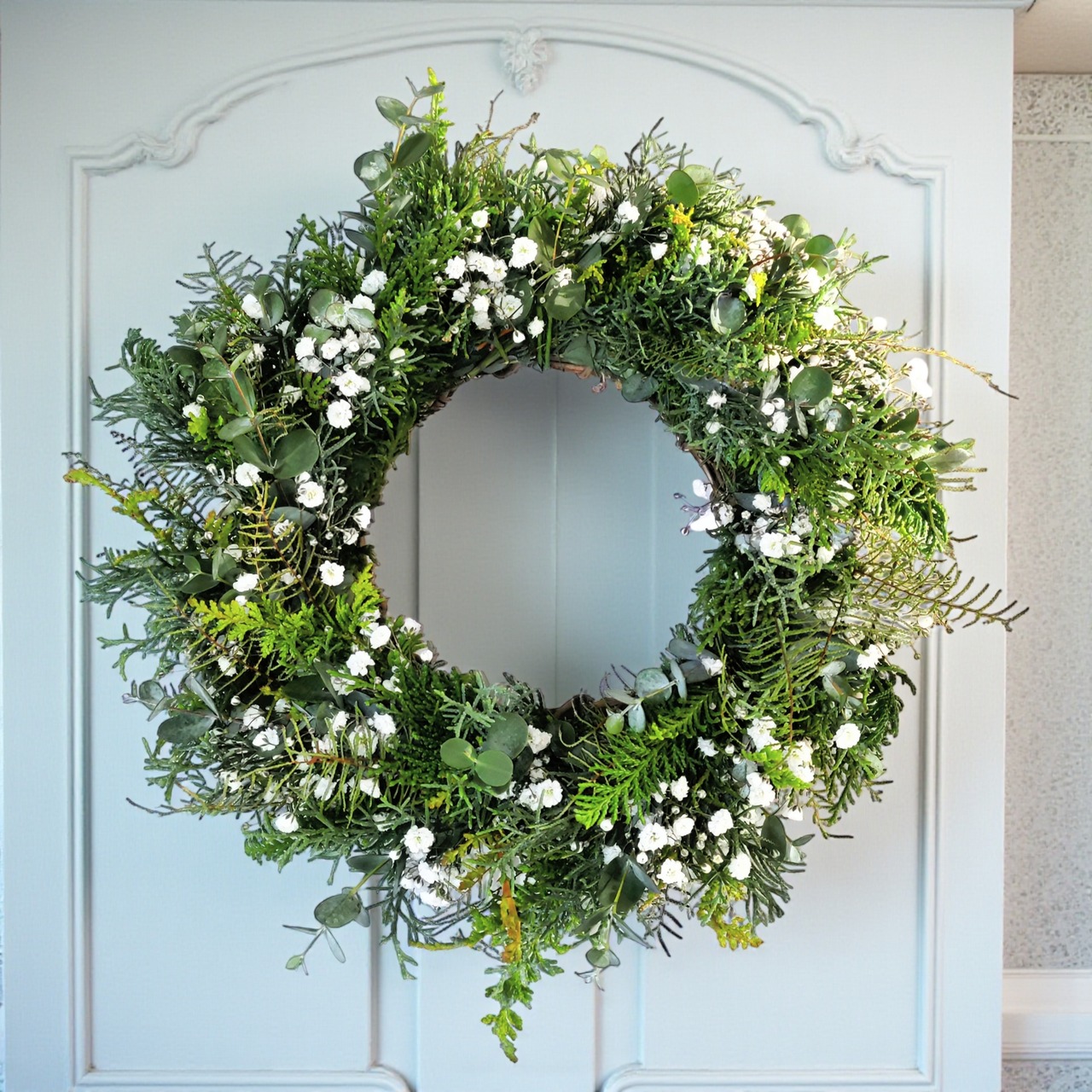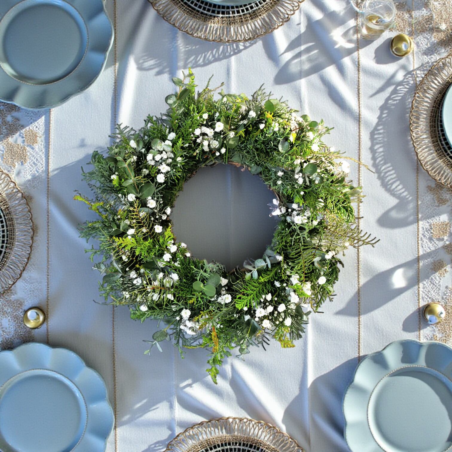 特別な瞬間を彩る、針葉樹とかすみ草の生花リースをご用意しました!