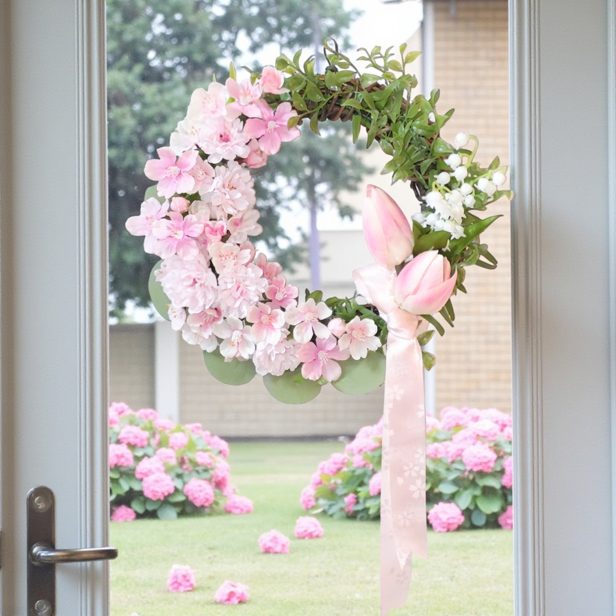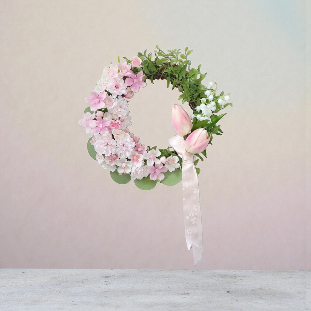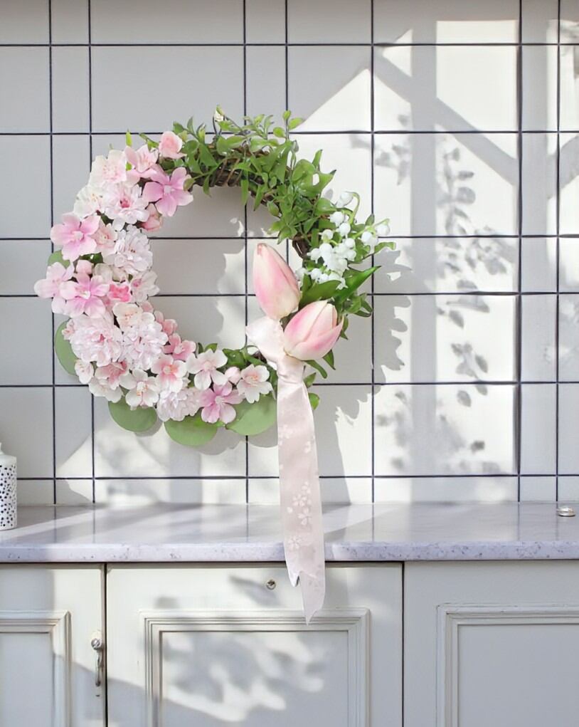 このリースは、約30cmのサイズで、桜とチューリップ、スズランを使用した華やかなデザインが特徴です。優しい色合いの花々が、あなたのインテリアに温もりをもたらし、心が和む特別な空間を演出します!飾るだけで、春の息吹が感じられること間違いなしです。