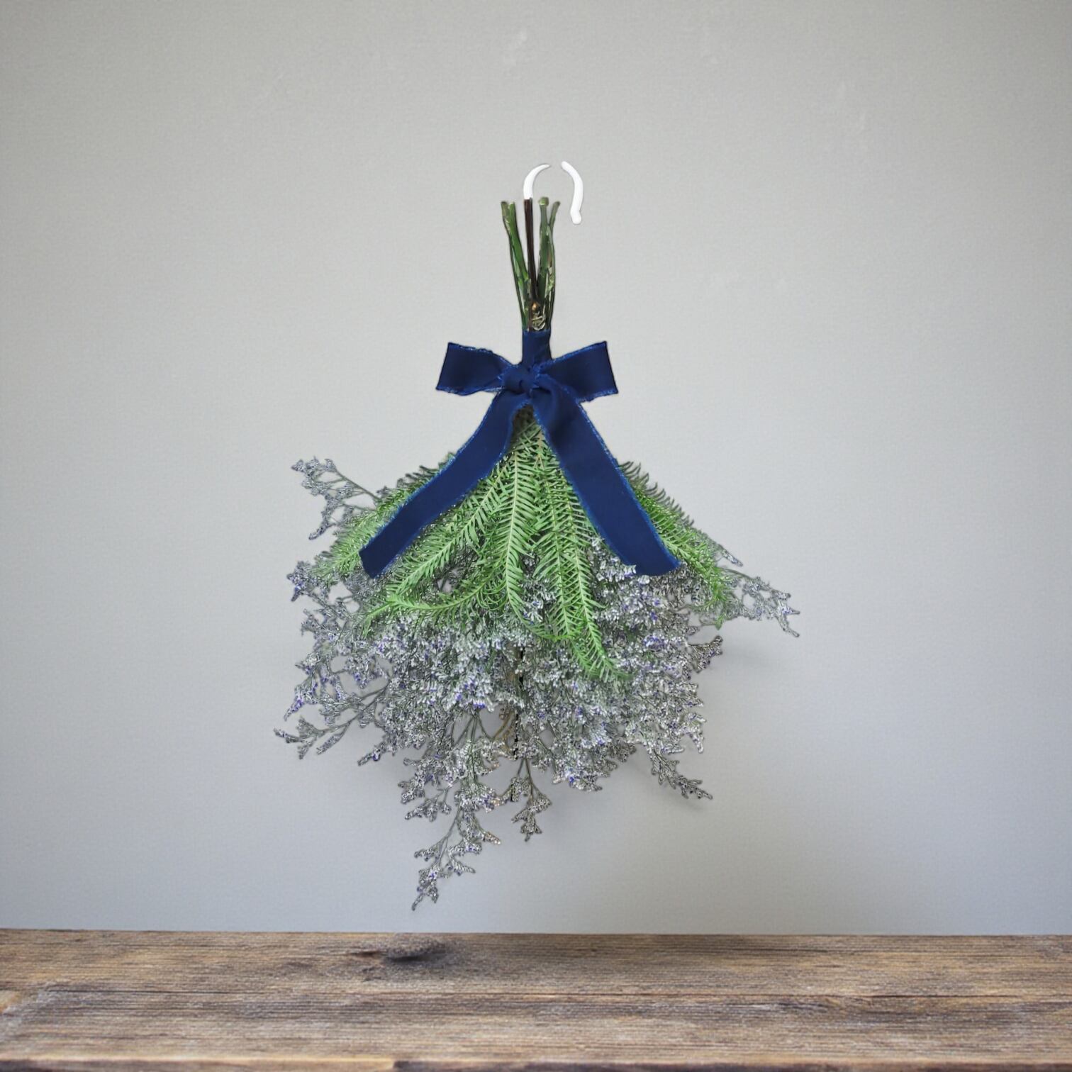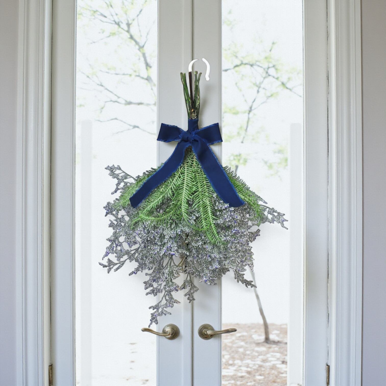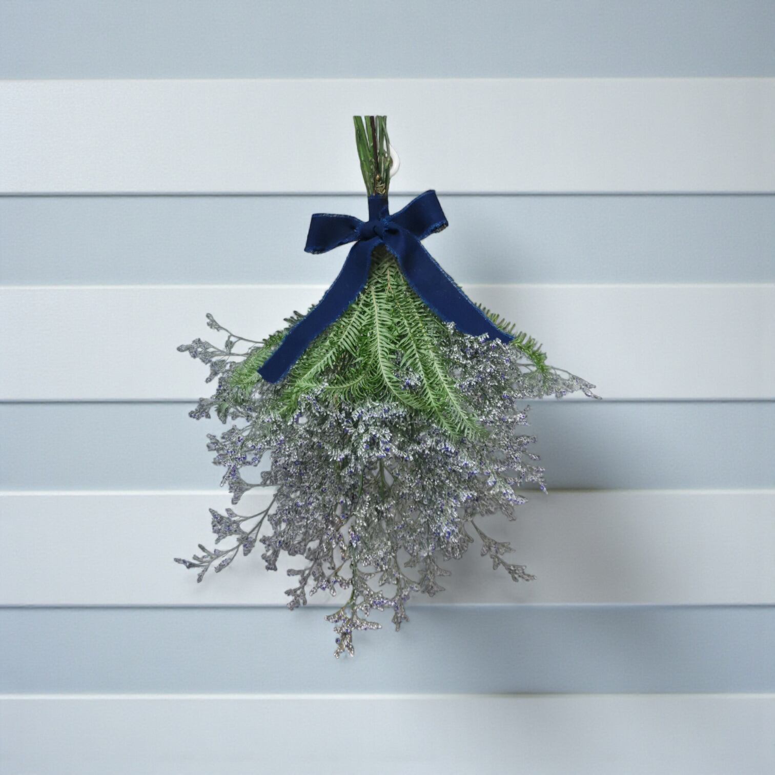 このスワッグは、約40cmのサイズで、ブルーファンタジーとアンブレラファンを使用した洗練されたデザインが特徴です。深いネイビー色のリボンがアクセントとなり、あなたのインテリアに特別な魅力をプラスします!飾るだけで、上品で心安らぐ空間を演出するアイテムです。