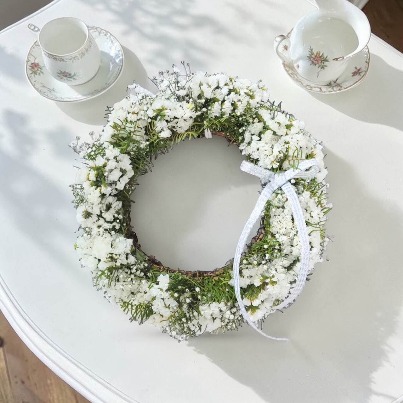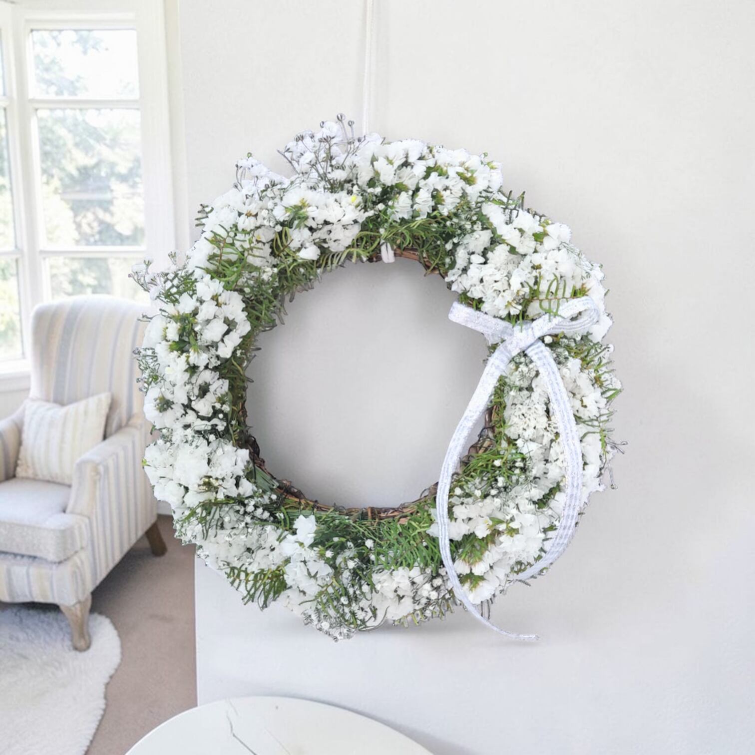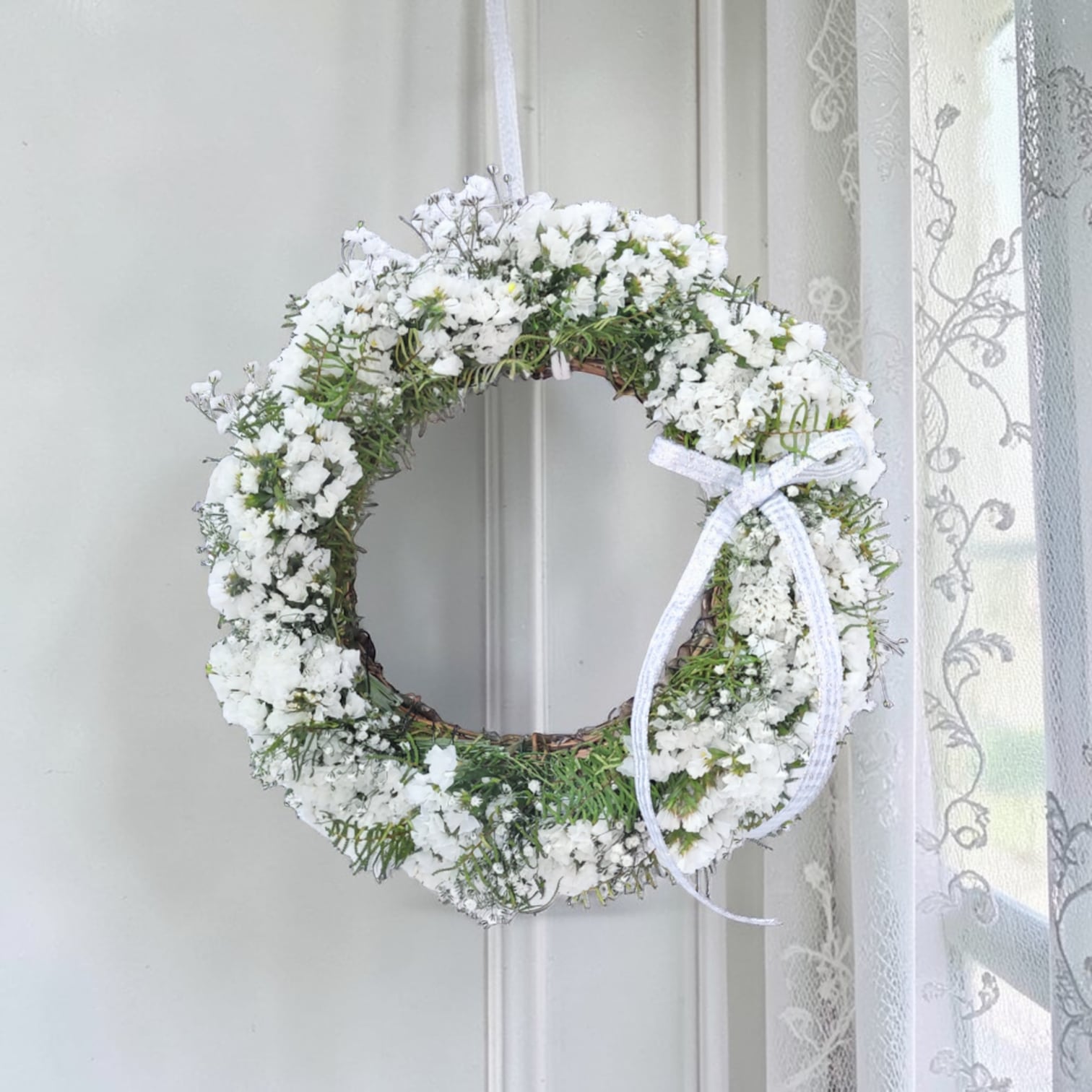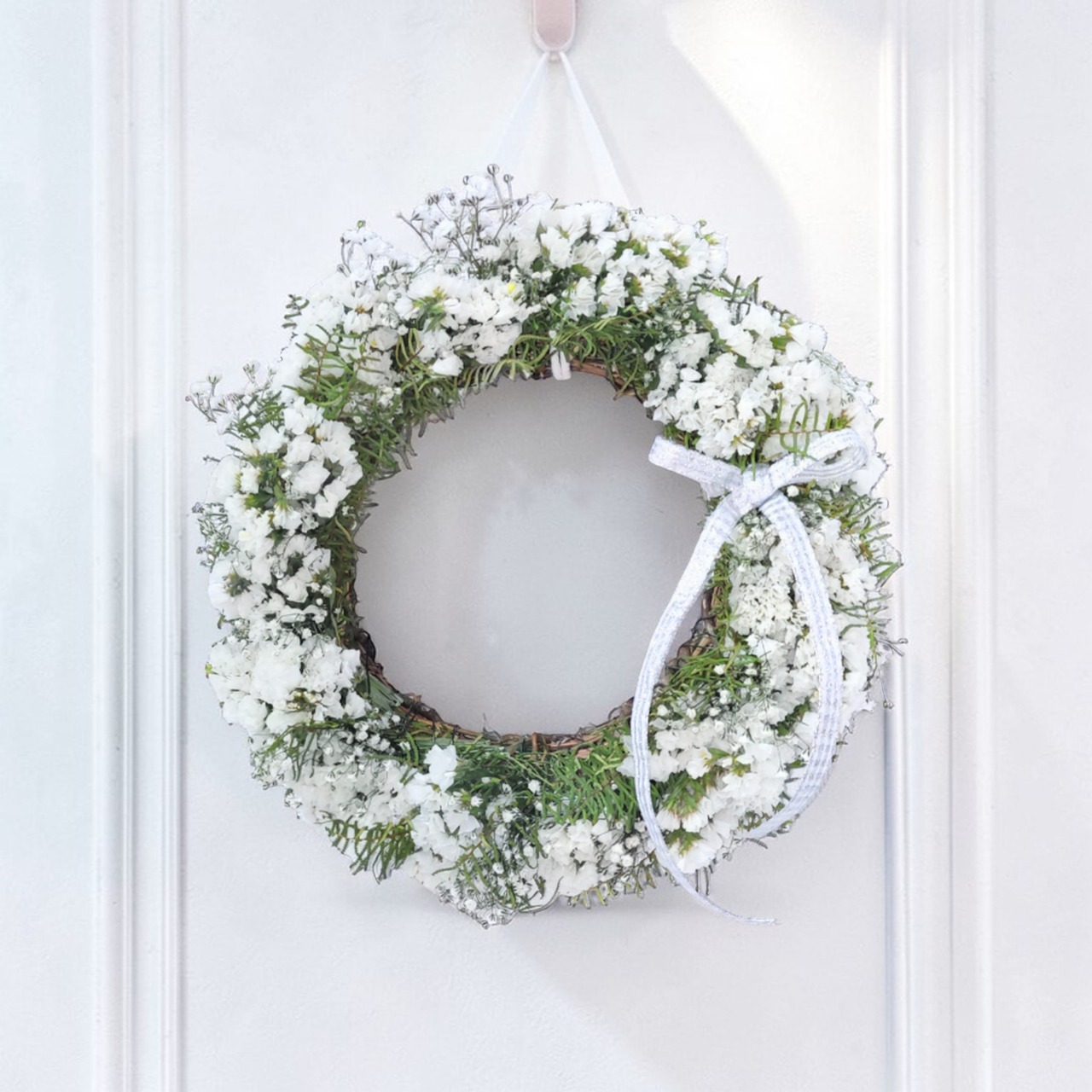 このリ−スは、約25cmのサイズで、スターチスとかすみ草、シ−スターファンを使用した素敵なデザインが特徴です。華やかさと柔らかさが調和し、あなたのインテリアにナチュラルな雰囲気を加えます!飾るだけで、穏やかな空間を演出できるアイテムです。