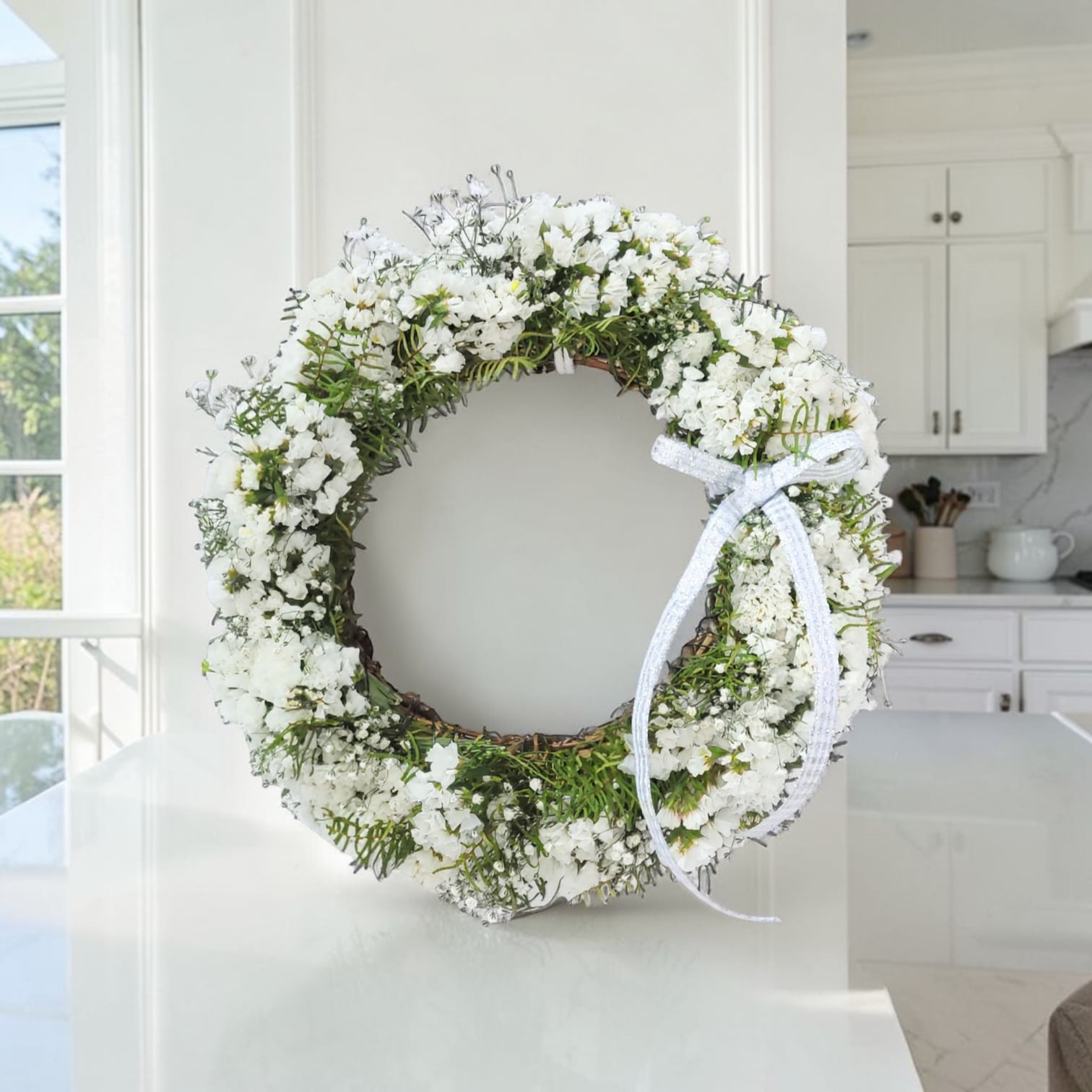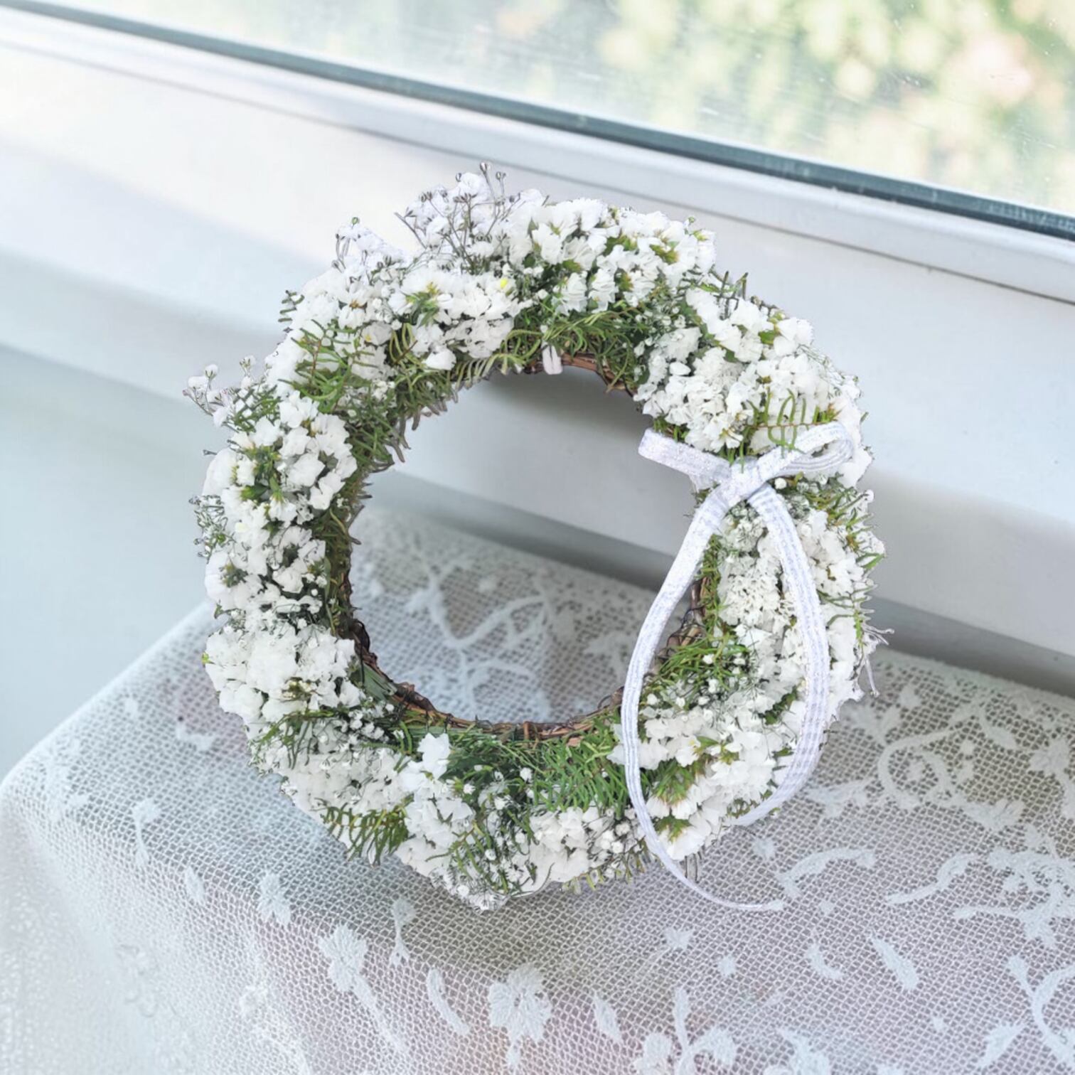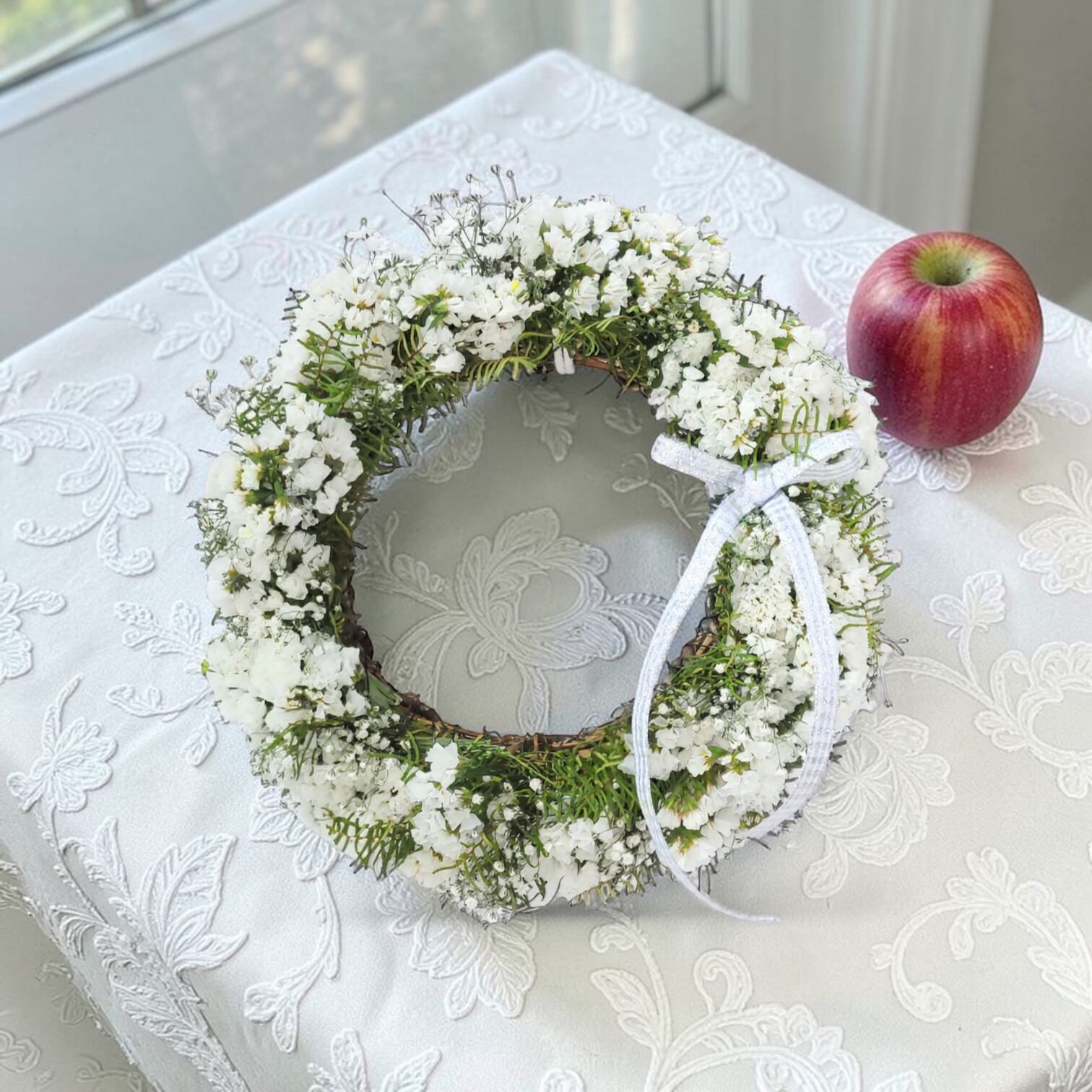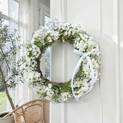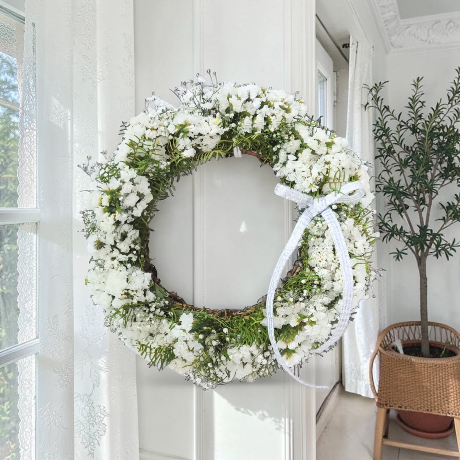 このリ−スは、約25cmのサイズで、スターチスとかすみ草、シ−スターファンを使用した素敵なデザインが特徴です。華やかさと柔らかさが調和し、あなたのインテリアにナチュラルな雰囲気を加えます!飾るだけで、穏やかな空間を演出できるアイテムです。